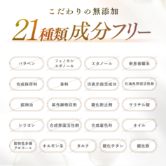 パラベン・フェノキシエタノール・エタノール・安息香酸系・合成保存料・香料・旧表示指定成分・石油系界面活性剤・鉱物油・紫外線吸収剤・酸化防止剤・サリチル酸・シリコン・合成界面活性剤・合成着色料・オイル・動物性多価アルコール・ホルモン系・タルク・酸化チタン・酸化鉄